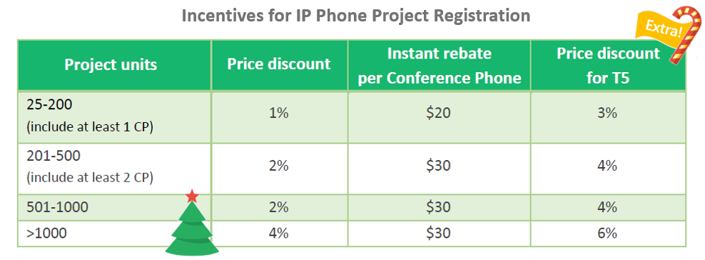 Up to 6% price discount is available for Yealink T5-series IP phones (T53/T53W, T54W, T57W, T58A, T58V) included in project. Other discounts and instant rebates are also available depending on Yealink model. Please see chart below for current program incentives.